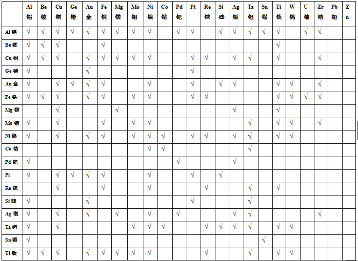 √---在表格內表示能夠使用超聲波焊接的各種金屬材料組。